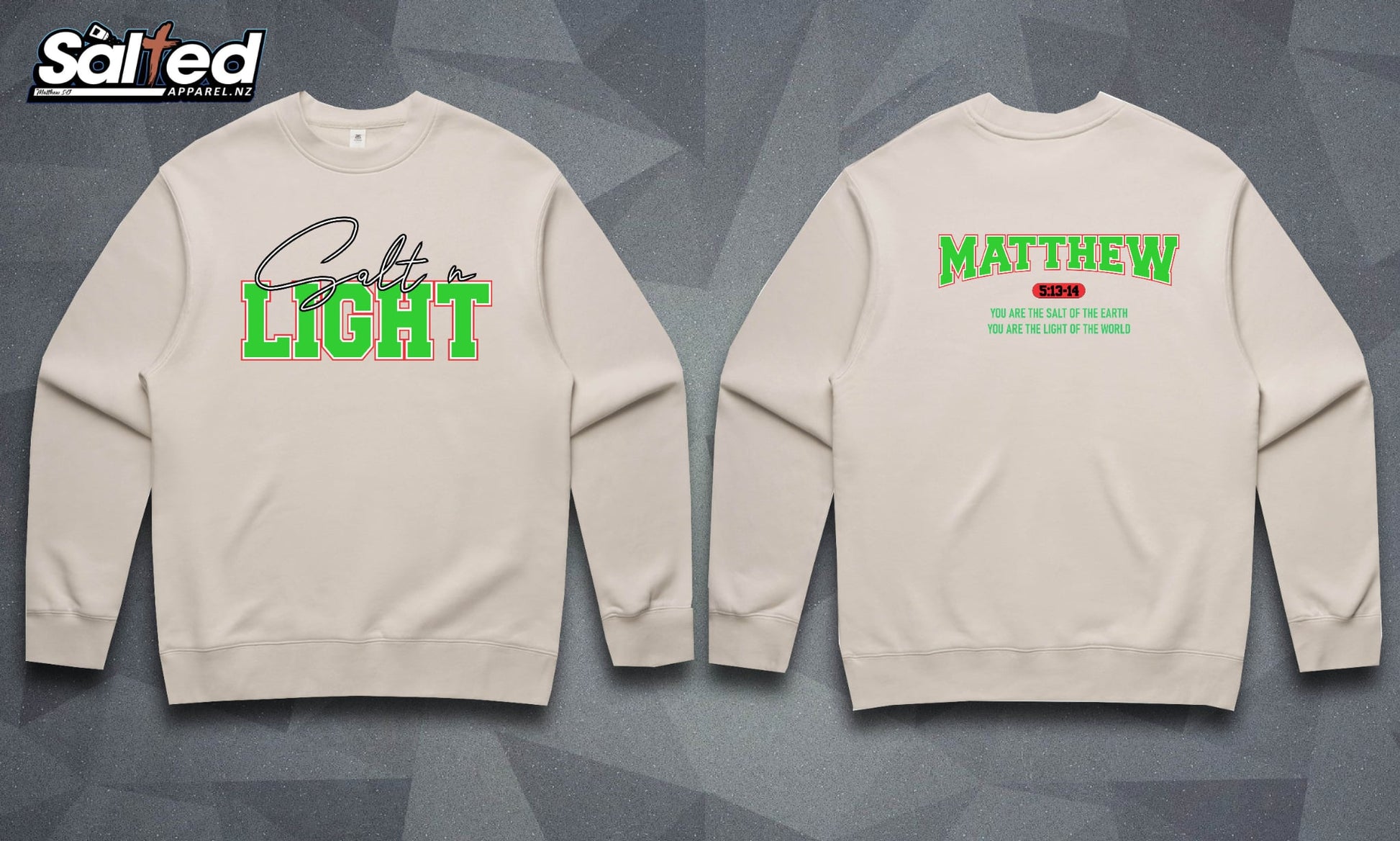 Crafted from premium heavyweight 320 GSM, 80% cotton, 20% recycled polyester CVC fleece. This crewneck is built for comfort, durability, and everyday wear. The Salt N Light design reflects bold faith and purpose, a reminder to stand out, inspire, and live true. Minimal, clean, and versatile, it’s the kind of piece that speaks louder than words.