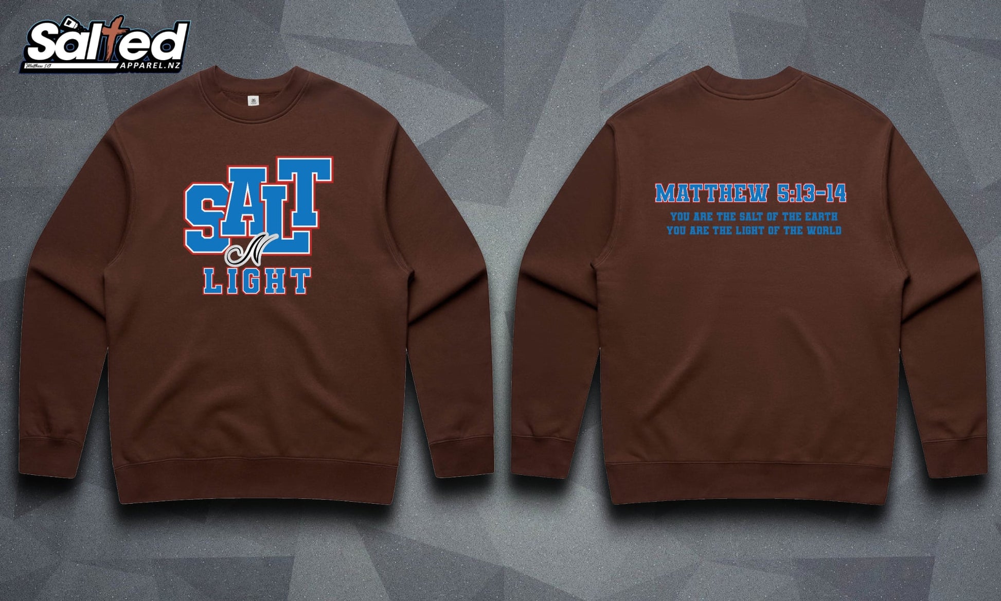 SALT N LIGHT CREW NECK - BROWN WITH BLUE FONT